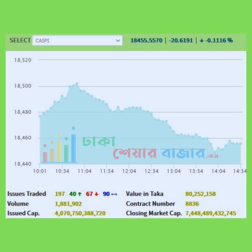 অপর দিকে দেশের ২য় শেয়ার বাজার চট্টগ্রাম স্টক এক্সচেঞ্জে (সিএসই) সূচক ও লেনদেন নেতিবাচক ধারাতে শেষ হয়েছে। সিএসই সার্বিক সূচক সিএএসপিআই ২০.৬১ পয়েন্ট কমে সূচক অবস্থান করছে ১৮৪৫৫.৫৫ পয়েন্টে।