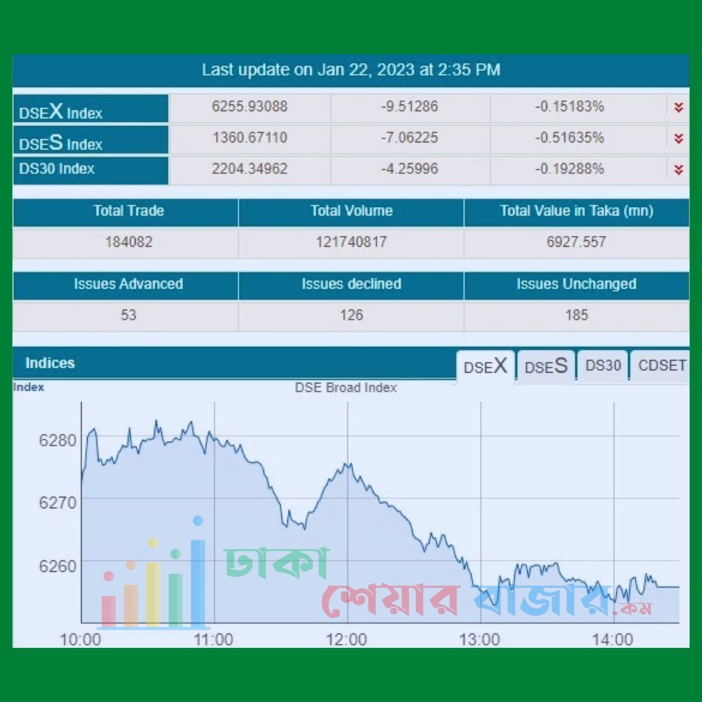 আজ রবিবার, ২২ জানুয়ারি ২০২৩, দেশের প্রধান পুঁজিবাজার ঢাকা স্টক এক্সচেঞ্জে (ডিএসই) মূল সূচক কমেছে তবে লেনদেন গতদিনের চেয়ে ইতিবাচক ধারাতে শেষ হয়েছে।