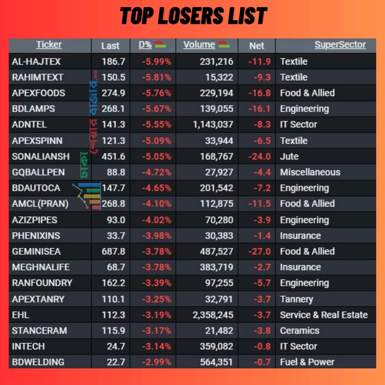 আজ শীর্ষ ২০ দাম কমার শীর্ষ তালিকায় ১০ টি খাতের শেয়ার ছিল। আজ যে সব শেয়ার কমার তালিকায় ছিল, সে গুলোর বেশ কয়েকটি গতকাল দাম বৃদ্ধির শীর্ষে ছিল। আজ দাম কমার শীর্ষ তালিকার প্রথমে ছিল আলহাজ্ব টেক্সটাইল লিমিটেড ।