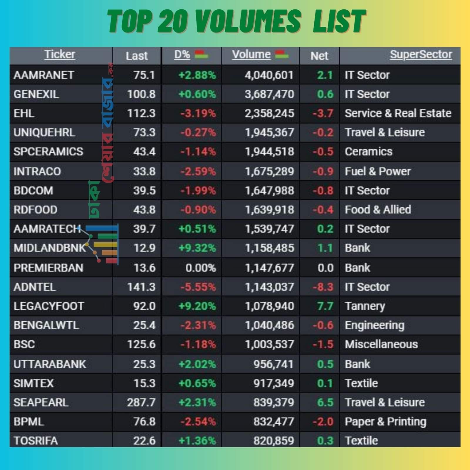 আজ শীর্ষ ২০ (ভলিউম) শেয়ারের সংখ্যার দিক দিয়ে লেনদেনে ৮ টি খাতের শেয়ার ছিল। আজ টপ ২০ শেয়ার সংখ্যার (ভলিউম) দিক দিয়ে প্রথমে ছিল আইটি খাতের আমার নেটওয়ার্কস লিমিটেড। গতকালও শেয়ারটি প্রথম তালিকায় ছিল। উল্লেখ্য অনেকদিন পরে আজ ব্যাংক খাতের ৩ টি ব্যাংক শীর্ষ ২০ (ভলিউম) শেয়ারের সংখ্যার দিক দিয়ে লেনদেনের তালিকায় চলে এসেছে।