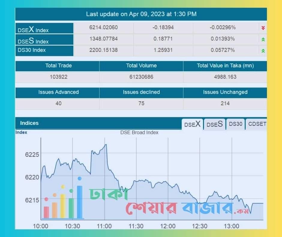 আজ রবিবার ৯ই এপ্রিল ২০২৩, সপ্তাহের প্রথমদিন দেশের প্রধান পুঁজিবাজার ঢাকা স্টক এক্সচেঞ্জের লেনদেনের মূল সূচক ডিএসইএক্স সূচক ০.১৮ পয়েন্ট কমে অবস্থান করছে ৬২১৪.০২ পয়েন্টে। এছাড়া ডিএসইএস বা শরীয়াহ সূচক ০.১৮ পয়েন্ট বেড়ে অবস্থান করছে ১৩৪৮.০৭ পয়েন্টে। ডিএস ৩০ সূচক ১.২৫ পয়েন্ট কমে দাঁড়িয়েছে ২২০০.১৫ পয়েন্টে।