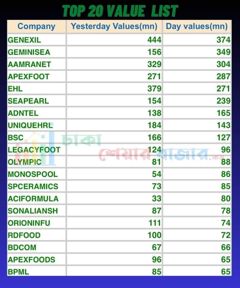 আজ শীর্ষ ২০ (ট্রেড ভ্যালু) লেনদেনের শীর্ষের তালিকায় বিভিন্ন খাতের শেয়ার ছিল। আজ শীর্ষ ২০ (ট্রেড ভ্যালু) লেনদেনের শীর্ষের তালিকায় ছিল জেনেক্স ইনফোসিস লিমিটেড, গতকালও শেয়ারটি প্রথম তালিকায় ছিল।