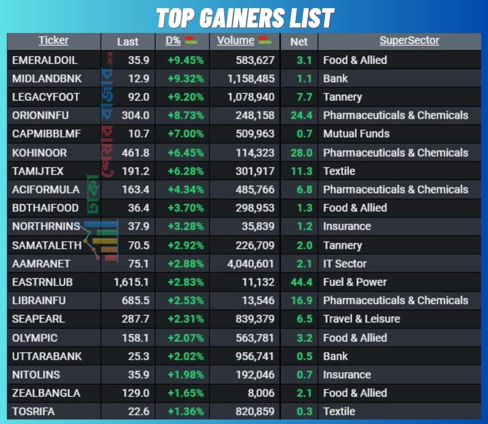 আজ শীর্ষ ২০ দাম বৃদ্ধির শীর্ষ তালিকায় ৯ টি খাতের শেয়ার ছিল। আজ দাম বাড়ার শীর্ষে ছিল জেড ক্যাটাগরির এমারেল্ড অয়েল।