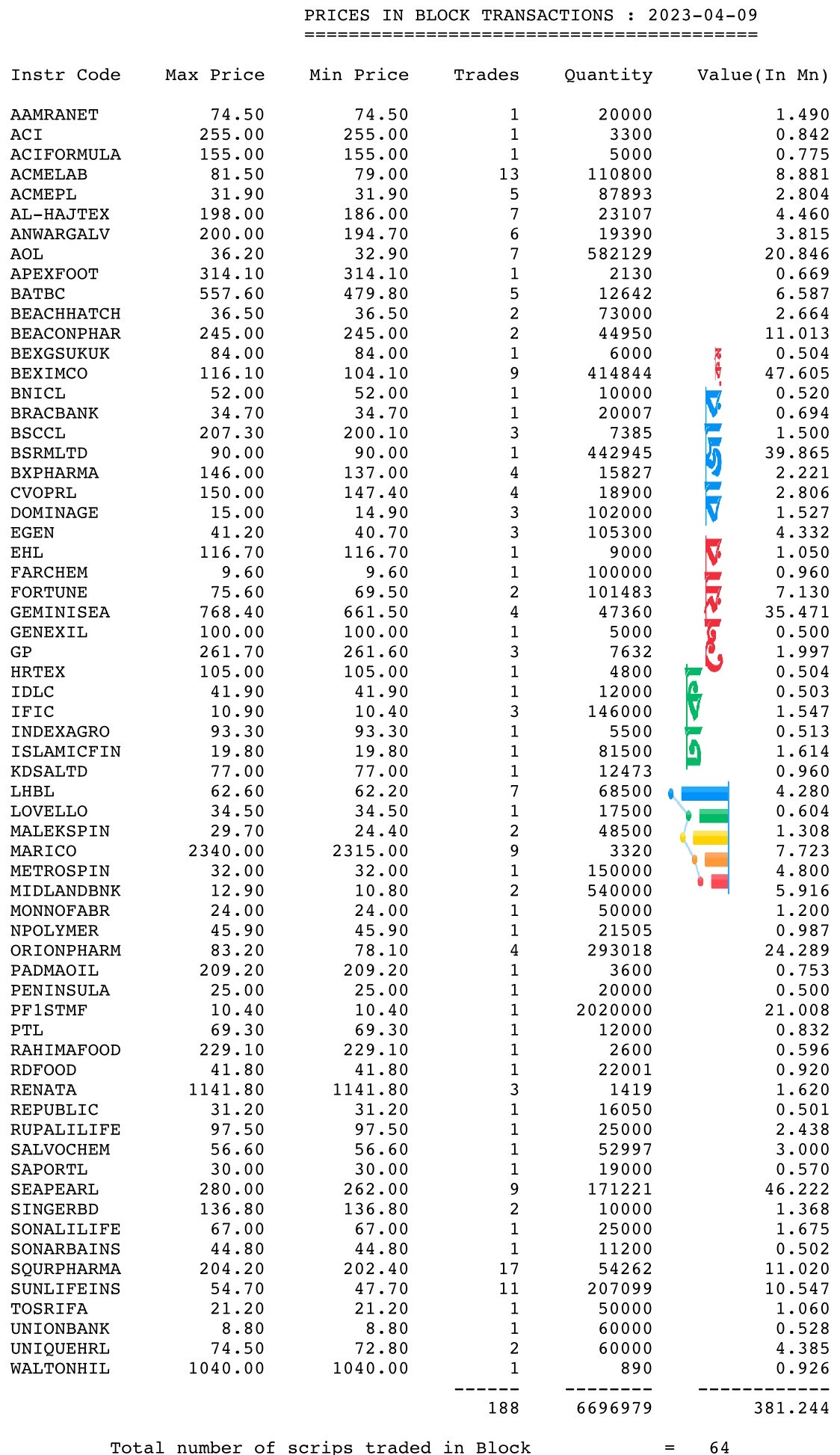 আজ ৬৪ টি শেয়ারের ব্লকে মোট লেনদেন হয়েছে ৩৮.১২ কোটি টাকা, গতকাল ব্লোকে মোট ৬৬ শেয়ারের ট্রেড হয়েছিল ৯৫.৪০ কোটি টাকা। আজ ব্লকে গত দিনের চাইতে ট্রেড কম হয়েছে ৫৭.২৮ কোটি টাকা। সে হিসাবে আজকের মূল মার্কেটের লেনদেন হয়েছে ৪৬০.৬৯ কোটি টাকা, যা গতকাল ছিল ৫১৬.৯১ কোটি টাকা। সে হিসাবে আজ গতকালের চেয়ে মূল মার্কেটে লেনদেন কম হয়েছে ৫৬.২২ কোটি টাকার।