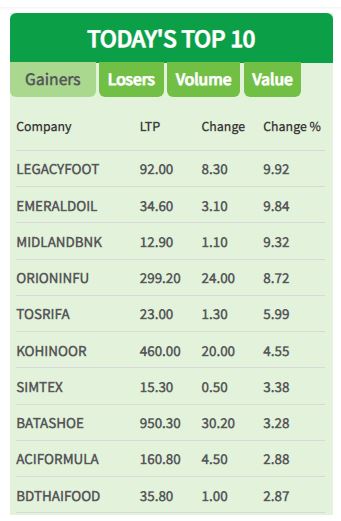 আজ সিএসইতে দাম বৃদ্ধির শীর্ষে থাকা ১০ টি শেয়ার।
