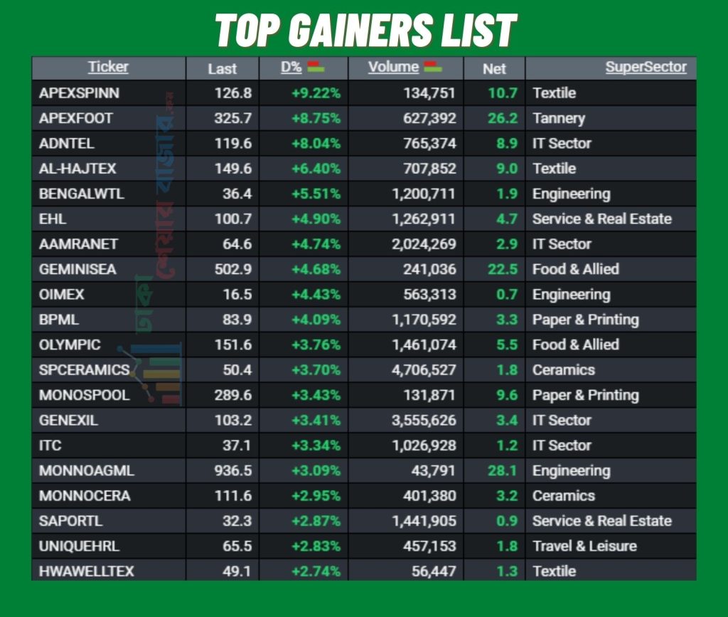 ডিএসইতে দর বৃদ্ধির শীর্ষ তালিকায় উঠে আসা  অন্যান্য কোম্পানিগুলোর মধ্যে এপেক্স ফুটওয়্যার বেড়েছে ৮.৭৫ শতাংশ, এডিএনটেলিকম ৮.০৪ শতাংশ, আলহাজ টেক্স ৬.৪০ শতাংশ, আমরা নেটওয়ার্ক ৫.৫৬ শতাংশ, বেঙ্গল উয়িন্ডোসোর ৫.৫১ শতাংশ, ইস্টার্ন হাউজিং ৪.৯০ শতাংশ, জেমিনি সিফুড ৪.৬৮ শতাংশ, উইমেক্স ৪.৪৩ শতাংশ ও বসুন্ধরা পেপার মিল বেড়েছে ৪.০৯ শতাংশ।