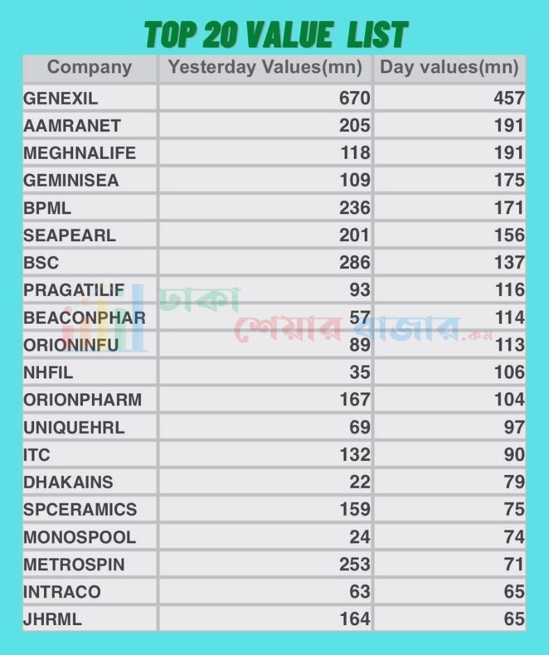 ডিএসিতে আজকের শীর্ষ ২০ ভ্যালু তালিকা
