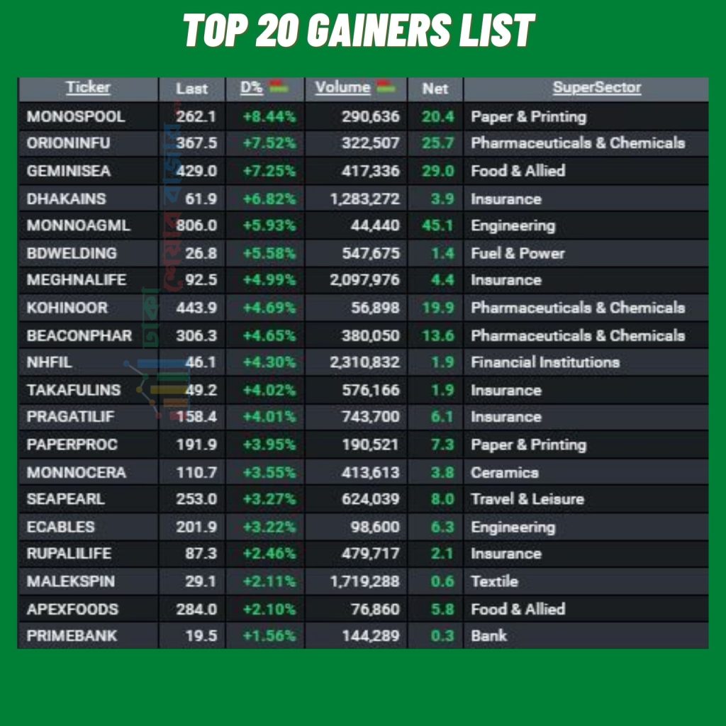 ডিএসিতে আজকের শীর্ষ ২০ গেইনার তালিকা