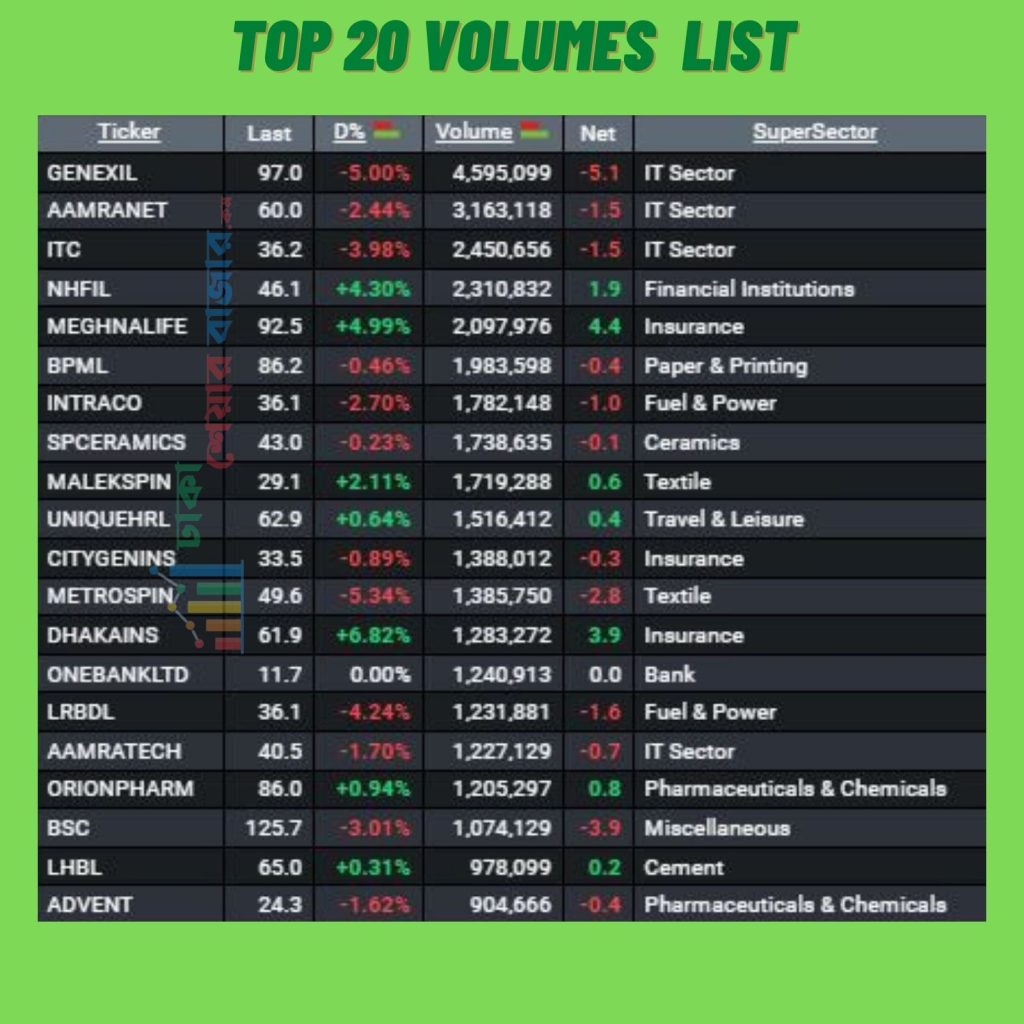 ডিএসিতে আজকের শীর্ষ ২০ ভলিউম তালিকা