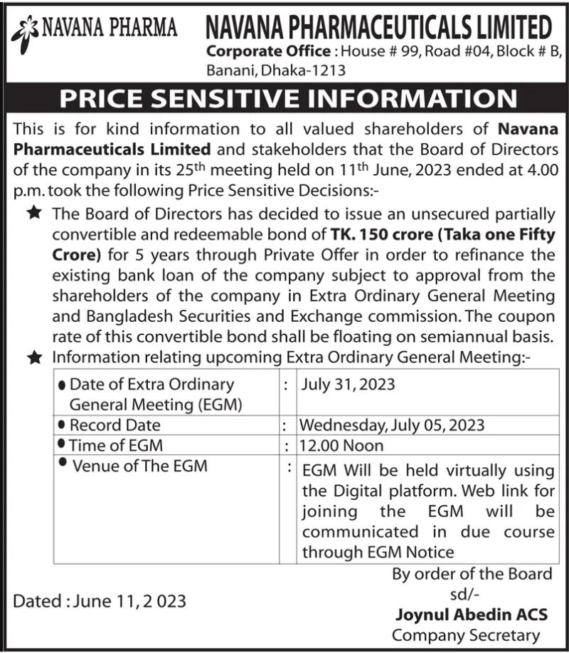 আজ রবিবার ১১ই জুন ২০২৩, অনুষ্ঠিত কোম্পানির পরিচালনা পর্ষদের ২৫তম বৈঠকে বন্ডইস্যু সংক্রান্ত এই সিদ্ধান্ত নেওয়া হয়েছে।