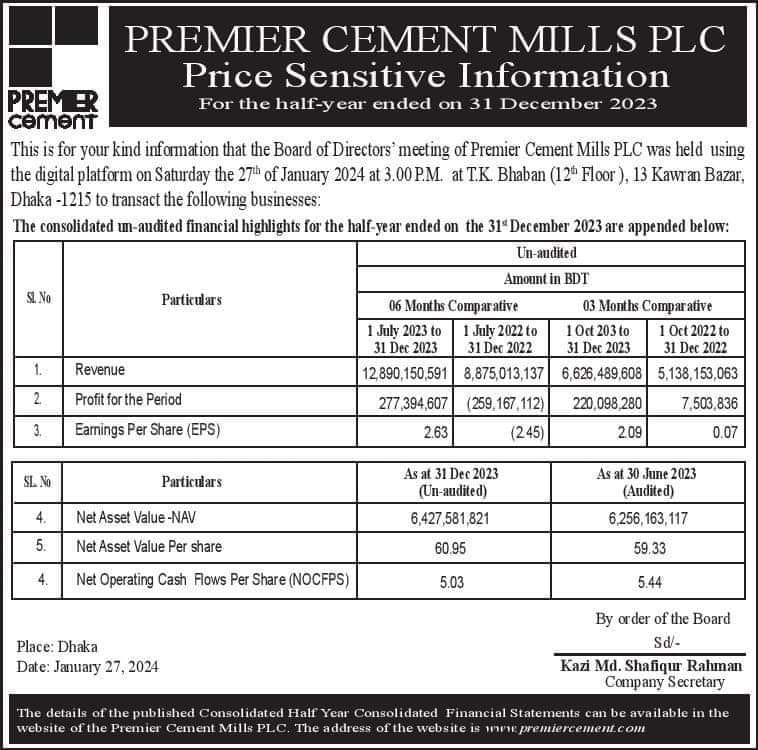 পুঁজিবাজারে তালিকাভুক্ত সিমেন্ট খাতের কোম্পানি প্রিমিয়ার সিমেন্ট মিলস পিএলসি (PREMIERCEM) কোম্পানি চলতি অর্থবছরের ২য় প্রান্তিকের (অক্টোবর ২০২৩-ডিসেম্বর ২০২৩) ও (জুলাই ২০২২-ডিসেম্বর২০২৩) অনিরীক্ষিত আর্থিক প্রতিবেদন প্রকাশ করেছে।