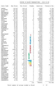 আজ ২৮ ডিসেম্বর, বুধবার দেশের প্রধান শেয়ার বাজার ঢাকা ষ্টক এক্সচেঞ্জে ৫৭ টি শেয়ারের ব্লকে মোট লেনদেন হয়েছে ৭৫.৩০ কোটি টাকা।
