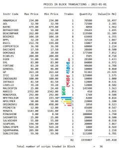 আজ ১ লা জানুয়ারী ২০২৩, দেশের প্রধান ঢাকা স্টক এক্সচেঞ্জে ব্লকে ৩৬ টি শেয়ারের মোট লেনদেন হয়েছে ১৪.৫৪ কোটি টাকা।