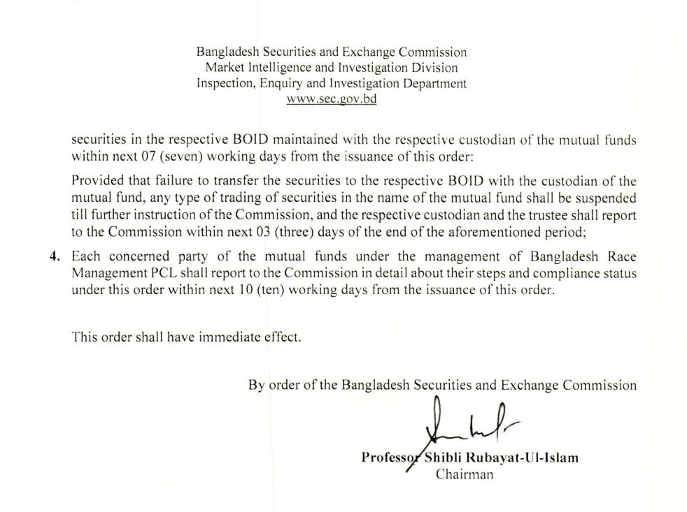 রেইসের বিভিন্ন তহবিলের বিপরীতে বিভিন্ন ব্রোকারেজ হাউসে অনুমোদিত যেসব বিও হিসাব রয়েছে, সেগুলো নিজেদের নিয়ন্ত্রণে আনার জন্য তহবিলের ট্রাস্টিদের নির্দেশ দিয়েছে বিএসইসি। পাশাপাশি এসব বিও হিসাবের বিস্তারিত প্রতিবেদন সাত দিনের মধ্যে কমিশনে জমা দিতে বলা হয়েছে। এ ছাড়া রেইসের তত্ত্বাবধানে থাকা মিউচুয়াল ফান্ডের হেফাজতকারী বা কাস্টডিয়ানকে অননুমোদিত সব বিও হিসাব বন্ধ করে সেখানে থাকা সব সিকিউরিটিজ সাত দিনের মধ্যে অনুমোদিত বিও হিসাবে স্থানান্তরেরও নির্দেশ দেওয়া হয়। অর্থাৎ বৈধ অনুমোদন ছাড়া যেসব বিও হিসাব খোলা হয়েছে, সেগুলো বন্ধ করে সেখানকার সব শেয়ার বৈধ বিও হিসাবে স্থানান্তরের জন্য কাস্টডিয়ানদের নির্দেশ দেওয়া হয়েছে।