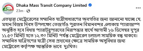 এতে বলা হয়, মহান বিজয় দিবস উপলক্ষে তেজগাঁও পুরাতন বিমানবন্দর এলাকায় প্যারা জাম্প অনুষ্ঠিত হবে। প্যারাট্রুপারদের নিরাপত্তার স্বার্থে আগামী ১৬ ডিসেম্বর দুপুর ১১টা ৫০ মিনিট থেকে ১২টা ৩০ মিনিট পর্যন্ত মেট্রোরেল চলাচল সাময়িক বন্ধ থাকবে।