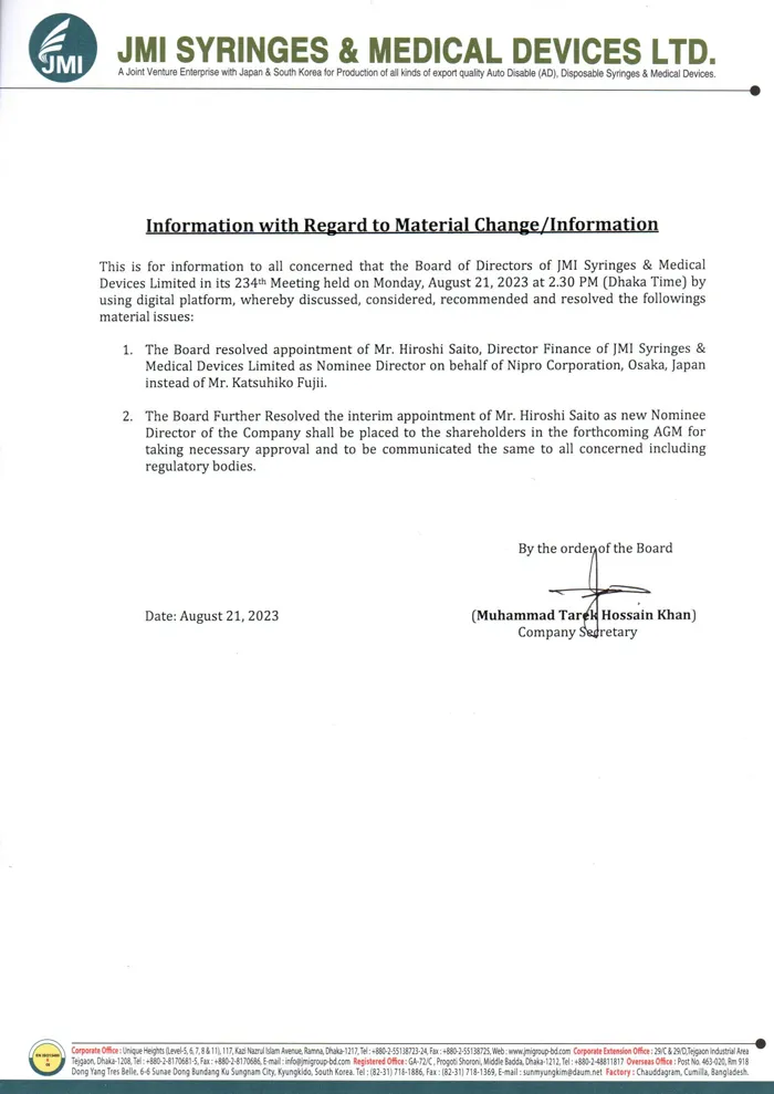 কোম্পানিটি জানিয়েছে যে ,কোম্পানির পরিচালনা পর্ষদ মিঃ কাতসুহিকো ফুজির পরিবর্তে নিপ্রো কর্পোরেশন, ওসাকা, জাপানের পক্ষ থেকে জেএমআই সিরিঞ্জস অ্যান্ড মেডিকেল ডিভাইস লিমিটেড–এর পরিচালক ফিন্যান্স মিঃ হিরোশি সাইতো–কে মনোনীত পরিচালক হিসাবে নিয়োগের সিদ্ধান্ত নিয়েছে। বোর্ড আরও সিদ্ধান্ত নিয়েছে যে কোম্পানির নতুন মনোনীত পরিচালক হিসাবে মিঃ হিরোশি সাইতোর অন্তর্বর্তীকালীন নিয়োগ,কোম্পানিটির আসন্ন বার্ষিক সাধারণ সভায় (এজিএম) শেয়ারহোল্ডারদের চূড়ান্ত অনুমতির পর মনোনীত পরিচালকের পদ গ্রহণ করতে পারবে।