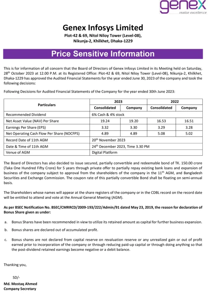 পুঁজিবাজারে তালিকাভুক্ত আইটি খাতের কোম্পানি জেনেক্স ইনফোসিস লিমিটেডের(GENEXIL) গত ৩০ শে জুন ,২০২৩ তারিখে সমাপ্ত হিসাব বছরের জন্য লভ্যাংশ ঘোষণাকরেছে।কোম্পানিটি আলোচিত বছরের জন্য শেয়ার হোল্ডারদের ১০শতাংশ নগদ লভ্যাংশ দিবে।এর মধ্যে নগদ লভ্যাংশ ৬ শতাংশ এবং বোনাস ৪ শতাংশ।