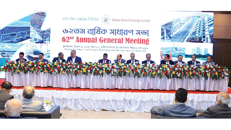 ঢাকা স্টক এক্সচেঞ্জ (ডিএসই) লিমিটেডের ৬২তম বার্ষিক সাধারণ সভা গত ২১ ডিসেম্বর রাজধানীর নিকুঞ্জে ডিএসই টাওয়ারে অনুষ্ঠিত হয়েছে। সভায় ৩০ জুন সমাপ্ত ২০২৩ অর্থবছরের কোম্পানির পরিচালকমণ্ডলীর প্রতিবেদন, নিরীক্ষিত আর্থিক প্রতিবেদন ও নগদ ৪ শতাংশ লভ্যাংশ ঘোষণা সর্বসম্মতিক্রমে অনুমোদিত হয়। পাশাপাশি পরবর্তী অর্থবছরের জন্য নিরীক্ষক নিয়োগ নির্ধারণ করা হয়।