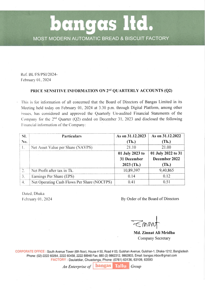 শেয়ারবাজারে তালিকাভুক্ত খাদ্য খাতের কোম্পানি বঙ্গজ লিমিটেড (BANGAS)এর চলতি অর্থবছরের ২য় প্রান্তিকের (অক্টোবর ২০২৩-ডিসেম্বর’২০২৩) ও (জুলাই ২০২৩-ডিসেম্বর ২০২৩) অনিরীক্ষিত আর্থিক প্রতিবেদন প্রকাশ করেছে।