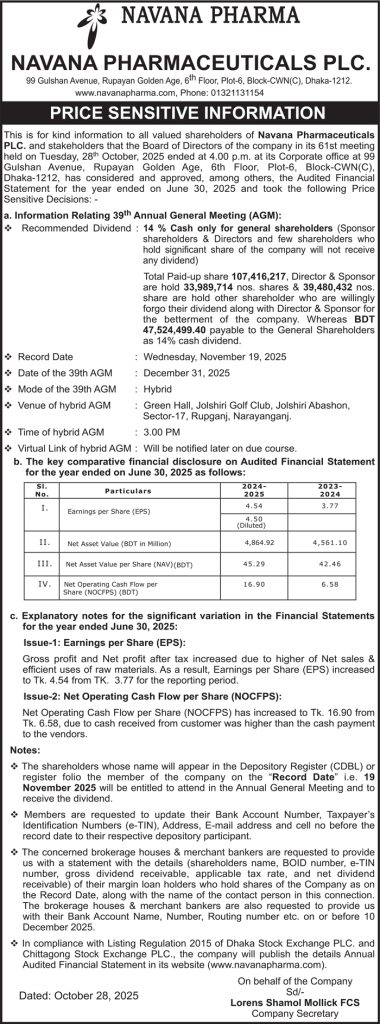 শেয়ারবাজারে তালিকাভুক্ত ওষুধ ও রসায়ন খাতের কোম্পানি নাভানা ফার্মাসিউটিক্যালস লিমিটেড (NAVANA) গত ৩০ শে জুন ২০২৫ তারিখে সমাপ্ত হিসাব বছরের জন্য লভ্যাংশ ঘোষণা করেছে।