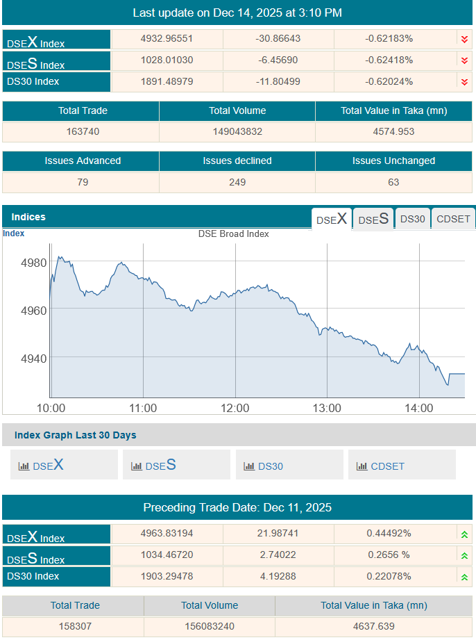 আজ রবিবার (১৪ ডিসেম্বর) সপ্তাহের চতুর্থ কার্যদিবস দেশের প্রধান পুঁজিবাজার ঢাকা স্টক এক্সচেঞ্জে (ডিএসই)লেনদেন ও সূচক উভয়ই কমেছে। কমেছে বেশির ভাগ কোম্পানির শেয়ারদর। প্রধান সূচক ডিএসইএক্সসহ তিনটি সূচকই ছিল নিম্নমুখী।