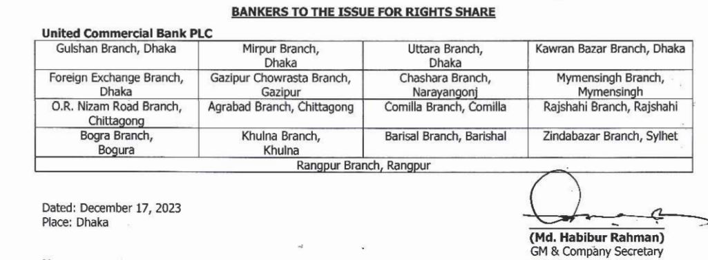 আগামী ৯ই জানুয়ারি রেকর্ড তারিখ নির্ধারণ করেছে কোম্পানিটি। কোম্পানিটি রাইট শেয়ার ইস্যু করে বাজার থেকে ২০ কোটি ১৯ লাখ ৬৫ হাজার ৬৬০ টাকা সংগ্রহ করবে। ৯ই জানুয়ারি রেকর্ড তারিখ পর্যন্ত যাদের শেয়ার থাকবে তারা রাইট শেয়ার পাবেন। রাইট শেয়ারের টাকা ব্যাংকের মাধ্যমে জমা দেয়া শুরু হবে ২৮ শে জানুয়ারি আর শেষ হবে ১৫ই ফেব্রুয়ারি ২০২৪ তারিখে। কোম্পানিটির রাইট শেয়ারের টাকা ইউনাইটেড কমার্শিয়াল ব্যাংক পিএলসিতে জমা দিতে হবে।