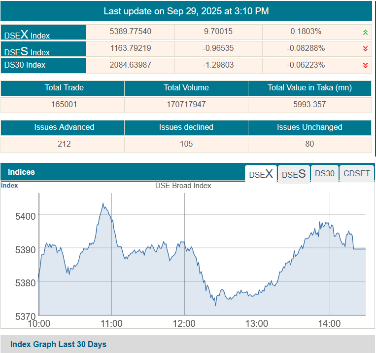 আজ ডিএসইর প্রধান সূচক ‘ডিএসইএক্স’ ৯ দশমিক ৭০ পয়েন্ট বেড়ে ৫ হাজার ৩৮৯ অবস্থান করছে।অন্যদিকে ‘ডিএসইএস’ সূচক ০.৯৬ পয়েন্ট কমে দাঁড়িয়েছে ১ হাজার ১৬৩ পয়েন্টে। আর ‘ডিএস-৩০’ সূচক কমেছে ১.২৯ পয়েন্ট, যা বর্তমানে ২ হাজার ৮৪ পয়েন্টে অবস্থান করছে।