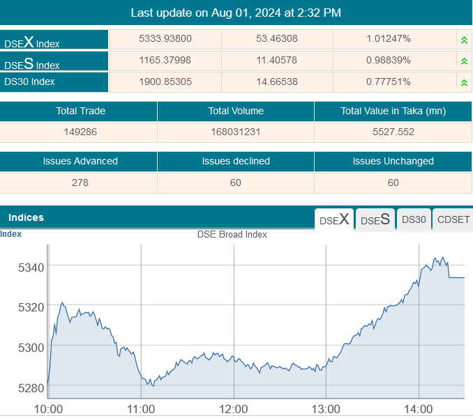 আজ বৃহস্পতিবার (১ আগস্ট) দেশের প্রধান শেয়ার বাজার ঢাকা স্টক এক্সচেঞ্জ পিএলসির (ডিএসই) সূচক ৫৩.৪৬ পয়েন্ট ইতিবাচক হওয়ায় অধিকাংশ কোম্পানির শেয়ারদর বেড়েছে। সেই সঙ্গে বেড়েছে লেনদেনের পরিমাণও। আজ ২৭৮ টি কোম্পানির শেয়ারের দাম বেড়েছে।